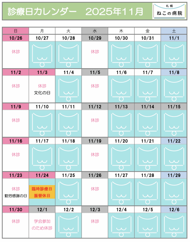 秋から冬にかけては、猫ちゃんたちの体調変化が起こりやすい季節です。 シニア猫ちゃんの定期検診や、食欲・体重・飲水量の変化が気になる際は、早めのご相談をおすすめします